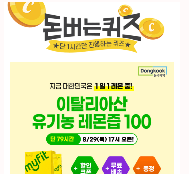 지금 대한민국은 1일 1레몬수 열풍! 오직 79시간! 카카오에서만 진행하는 역대급 혜택 놓치지 마세요 100% OOOO산 유기농 레몬즙인 '마이핏 유기농 레몬즙 100'은, 1포당 레몬1개가 통째로 들어있어 매일 간편하게 레몬수 관리를 할 수 있습니다.